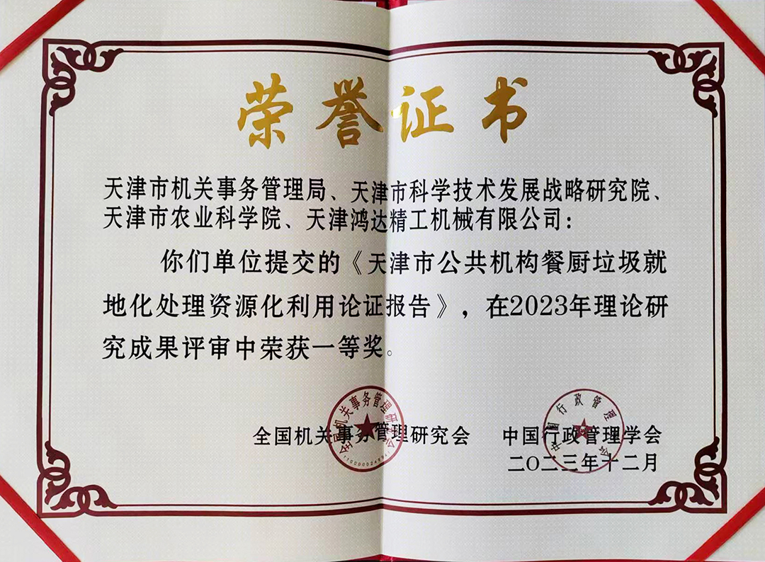 安达集团下属子公司鸿达精工机械有限公司与天津市机关事务管理局、天津市科学技术发展战略研究院、天津市农业科学院共同参与的《天津市公共机构餐厨垃圾就地化处理资源化利用论证报告》在2023年理论研究成果评审中荣获一等奖。鸿达精工副总经理庄儒国作为获奖企业代表在会上发言。